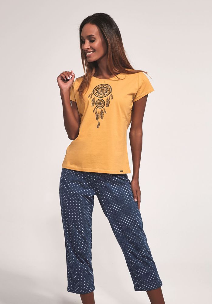 Dámské bavlněné pyžamo. Horní díl s krátkým rukávem a potiskem. Kalhoty 3/4 střihu. Baleno v dárkové krabičce.