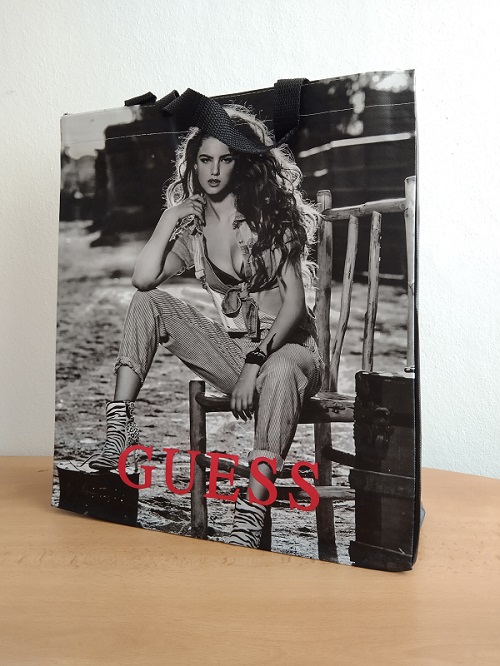 Stylová dárková taška Guess velká v černobílé barvě s červeným nápisem značkyGUESS.