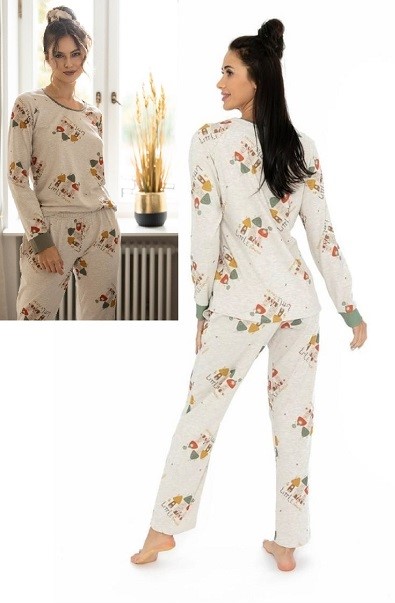 Dámské bavlněné pyžamo je perfektní volbou pro ženy, které oceňují pohodlí v kombinaci s jemnou elegancí. Model tvoří tričko s dlouhým rukávem zakončené manžetami a dlouhé kalhoty. Kalhoty mají pohodlný elastický pas který se dokonale přizpůsobí postavě a zajistí volnost pohybu a pohodlí po celou noc. Baleno v transparentním obalu.