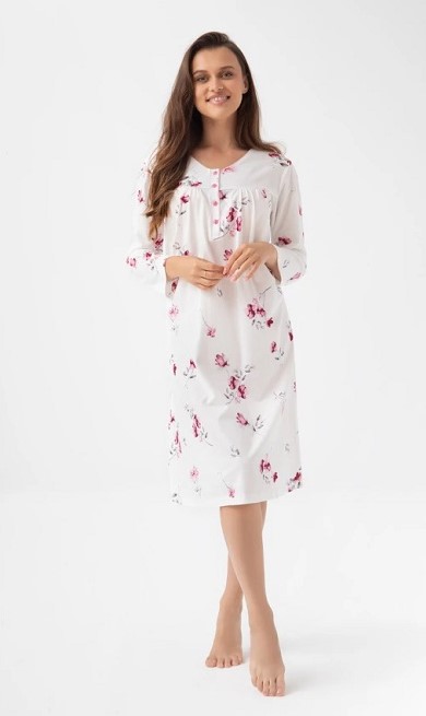 Dámská noční košile je vyrobená ze 100% bavlny a je příjemná na dotek. Košilka má vzorovaný design, dlouhé rukávy. Výstřih se zapínáním na knoflíčky. Délka košilky pod kolena. Baleno v transparentním obale.