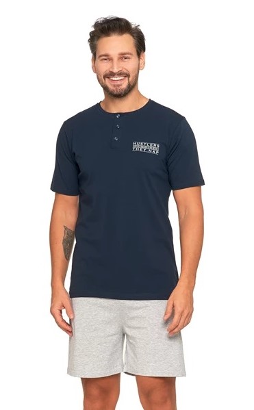 Pánské dvoudílné pyžamo z měkké bavlny. Set se skládá z trička s krátkým rukávem, výstřih na knoflíky a z kraťasů s kapsami. Pyžamo je příjemné na dotek a dokonale se přizpůsobí tělu a zajistí pohodlí během spánku. Baleno v transparentním obalu.