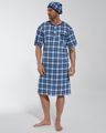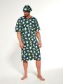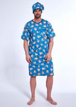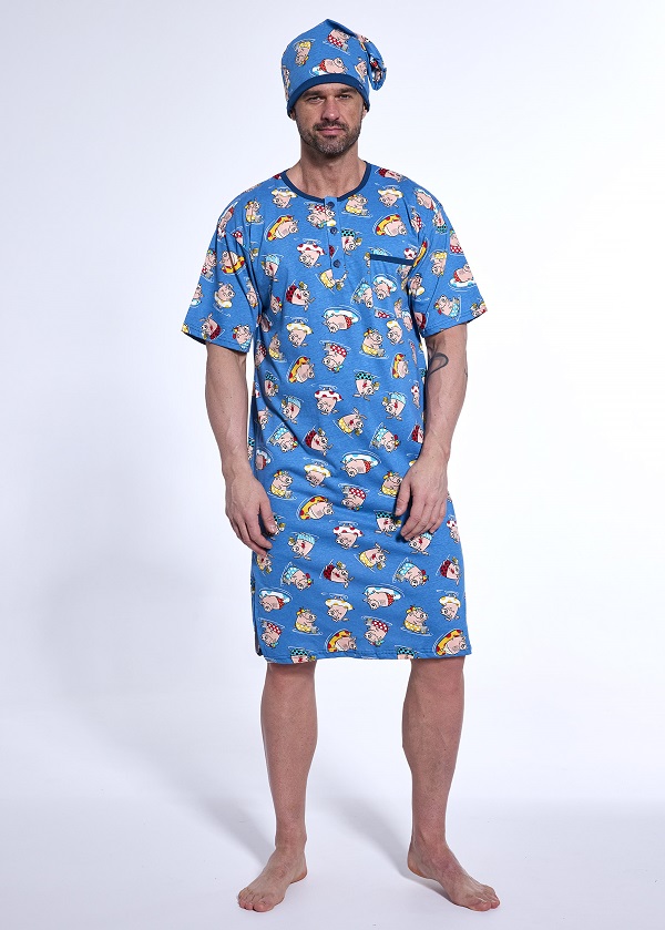 Pánská noční košile z kvalitní bavlny, obrázkovým potiskem, kulatým výstřihem na knoflíčky, kapsičkou, krátkými rukávy a stylovou čepičkou. Baleno v dárkové krabici.