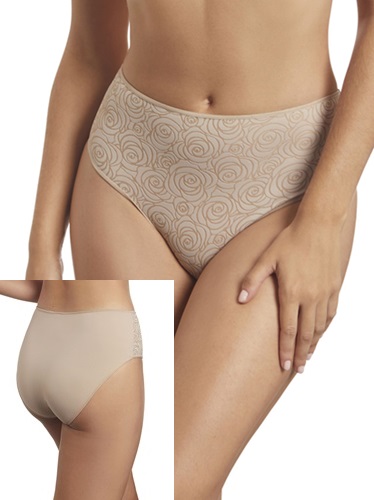 Dámské kalhotky vysoké, vpředu s jemným potiskem a hladkou látkou vzadu. Kalhotky mají bavlněný klínek. Baleno  v krabičce.