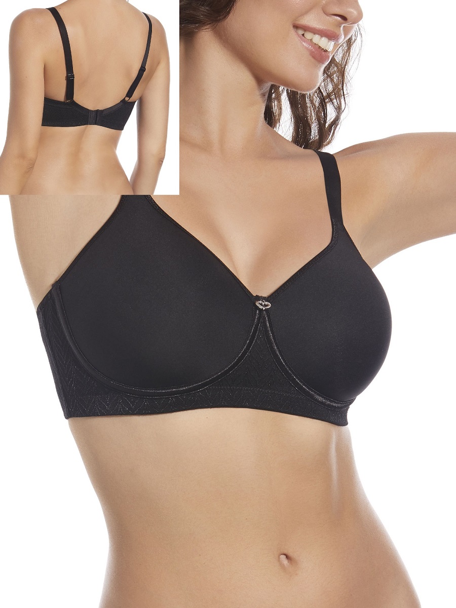 Dámská podprsenka bez kostic, košíčky Spacer cup jsou hladké, poskytují celkovou prodyšnost a přizpůsobivost hrudníku. Širší objem podprsenky je zdoben jemným vzorem. Podprsenka má nastavitelné ranímka. Vzadu je dvojté zapínání nad sebou s možnosti regulace objemu ve 4 pozicích. Baleno v krabičce.