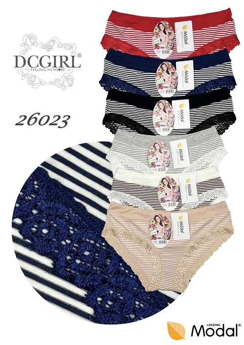 Dámské kalhotky z kvalitního měkkého modalu. Nohavice kalhotek jsou zdobené jemnou krajkou. Balení je po 12 kusech mix velikostí (S-2x, M-4x, L-4x, XL-2x) a mix květinových barev. Baleno v transparentním obale.