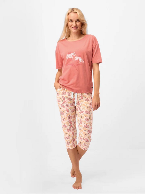 Dámské letní pyžamo nebo volnočasové oblečení s horním dílem s krátkými rukávy, aplikací a vzorovanými 3/4 kalhotami. Baleno v transparentním obalu.