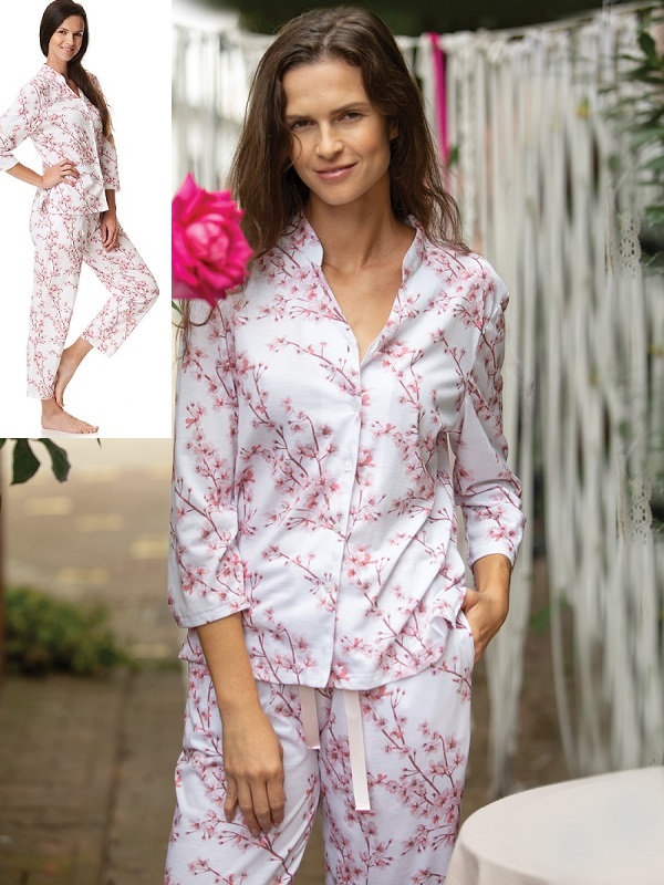 Dámské pyžamo vyrobené z vysoce kvalitní bavlny. Vzorovaná košile je s 3/4 rukávem a zapínáním na knoflíky. Dlouhé vzorované kalhoty s kapsami a saténovou mašlí v pase. Baleno v transparentním obale.
