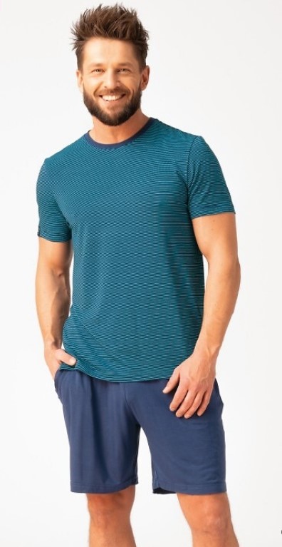 Pánské pyžamo vyrobeno z vysoce kvalitního bambusového vlákna. Pyžamo je prodyšné, bambusová pletenina je příjemná na dotek, antibakteriální a hypoalergenní. Tkanina má termoregulační vlastnosti. Tričko je pruhované, rovného střihu, má kulatý výstřih zakončený lemem a klasické krátké rukávy. Nohavice jsou krátké, s kapsami, pohodlné, mají měkký elastický pas a bavlněnou šňůrku pro nastavení v pase. Baleno v transparentním obalu.