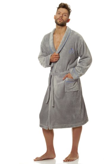 Pánský župan se zavazováním v pase. Župan je vyrobený z měkké tkaniny. Model má na bocích kapsy, bez kapuce a na hrudníku ozdobnou aplikaci.