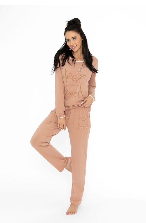 Dámské bavlněné pyžamo je perfektní volbou pro ženy, které oceňují pohodlí v kombinaci s jemnou elegancí. Model tvoří tričko s dlouhým rukávem zakončené manžetami a dlouhé kalhoty. Kalhoty mají pohodlný elastický pas který se dokonale přizpůsobí postavě a zajistí volnost pohybu a pohodlí po celou noc. Baleno v transparentním obalu.
