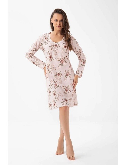 Dámská noční košile je vyrobená ze 100% bavlny a je příjemná na dotek. Košilka má vzorovaný design, dlouhé rukávy. Výstřih do "V". Délka košilky na kolena. Baleno v transparentním obale.