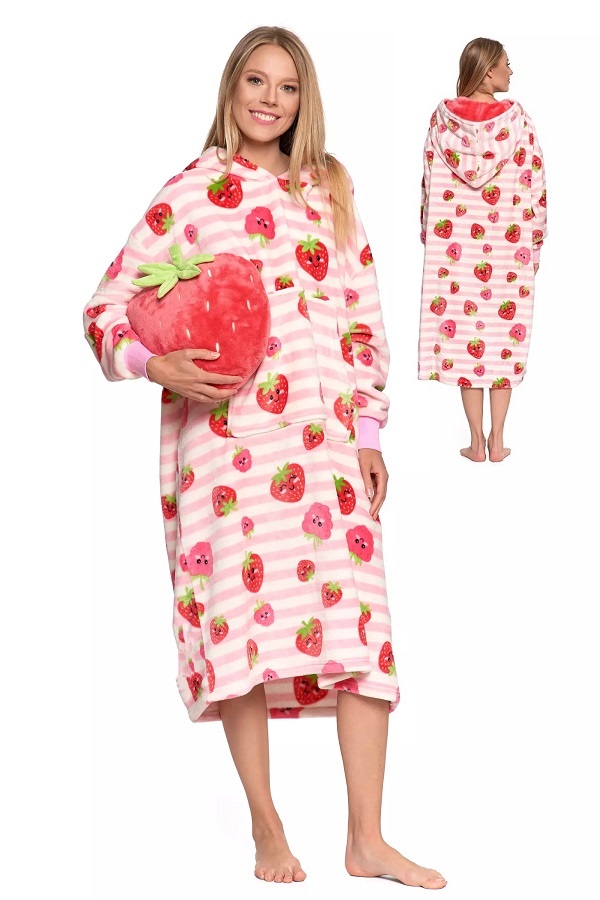 Dámská domácí mikina nepostradatelná v chladných dnech, je perfektním doplňkem vašeho šatníku. Mikina vyrobená z vysoce kvalitního fleecového materiálu je měkká a příjemná na dotek. Materiál se také snadno udržuje - můžete jej prát v pračce bez obav z poškození nebo ztráty tvaru. Lze zabalit do tvaru jahoda. Baleno v transparentním obalu.