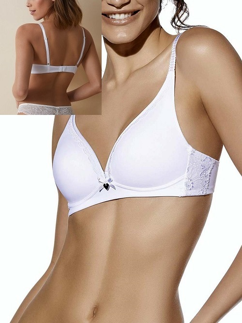 Dámská podprsenka bez kostic, lehce vystužená. Košíčky a bok podprsenky je zdoben lehce krajkou. Ramínka podprsenky jsou nastaviltené a zbobené. Zapínání je na 2 háčky a na 4 pozice. Baleno v krabičce.